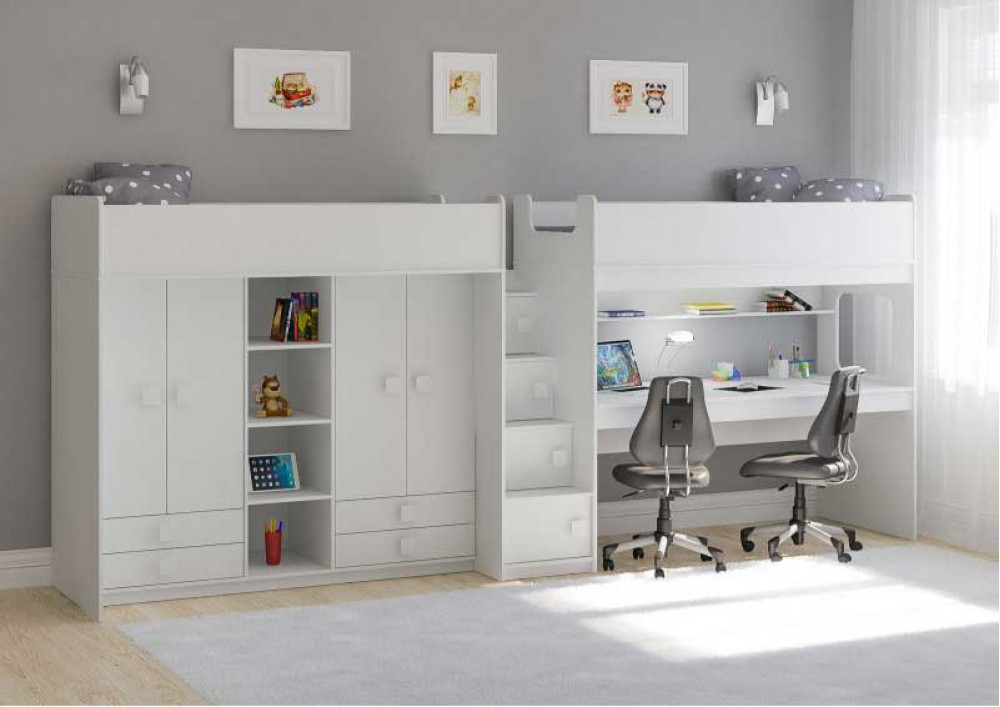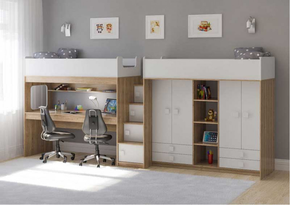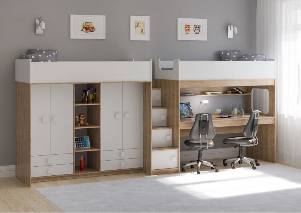 Две кровати, два шкафа, большое рабочее место – одна лестница.