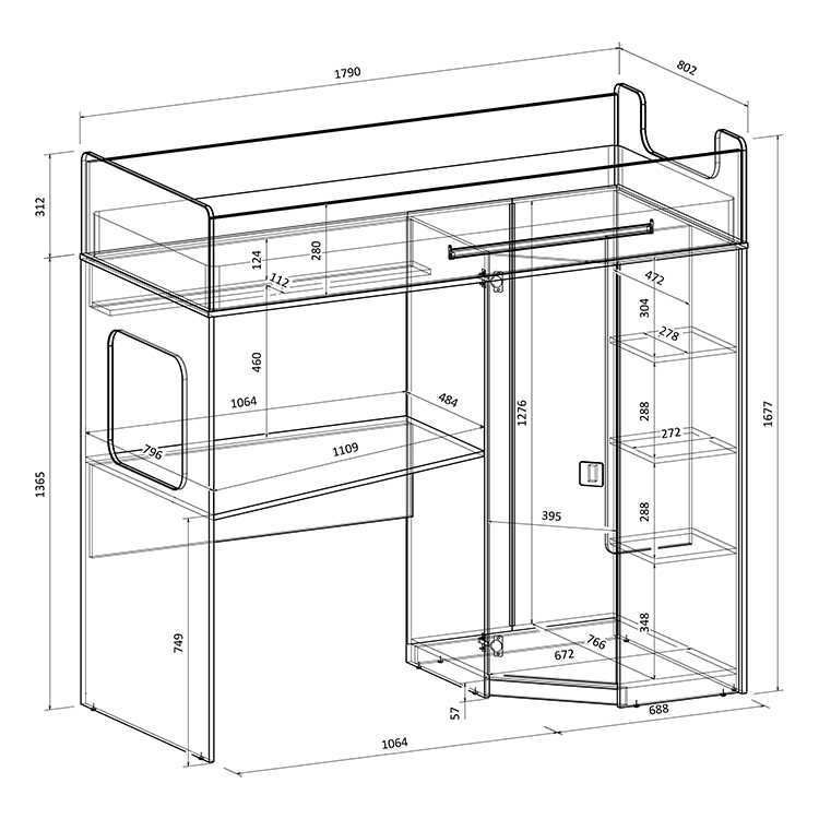 Учебная зона со столом под спальным местом открывает возможности для письменных работ, а также здесь удобно расположить ноутбук.